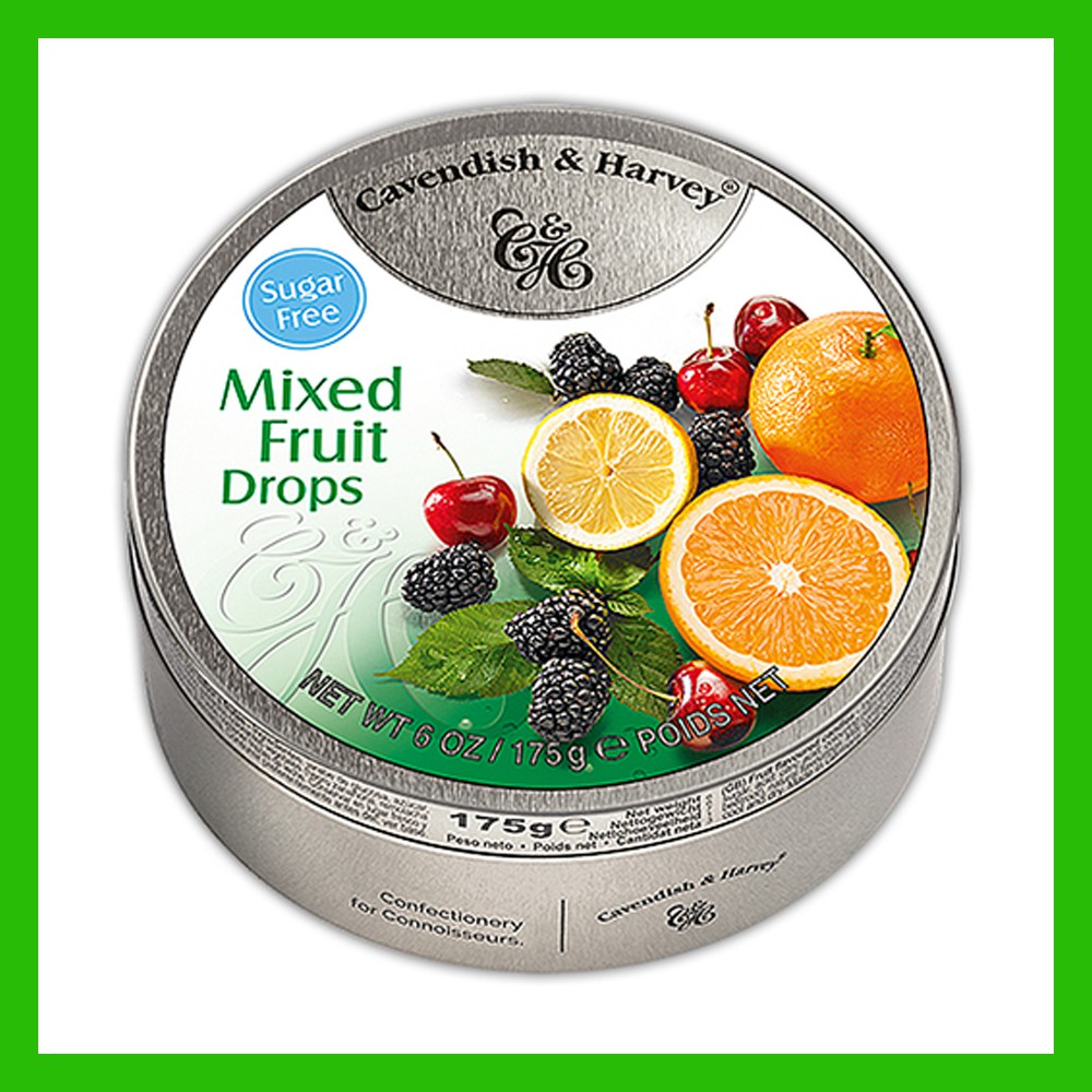 The classic mix of delicious fruit drops lemon cherry blackberry and orange but without the sugar. 3088 100 Gramm Add to basket View product. Cavendish Harvey Mixed Fruit Drops sugar free 2 x 175g Tin.