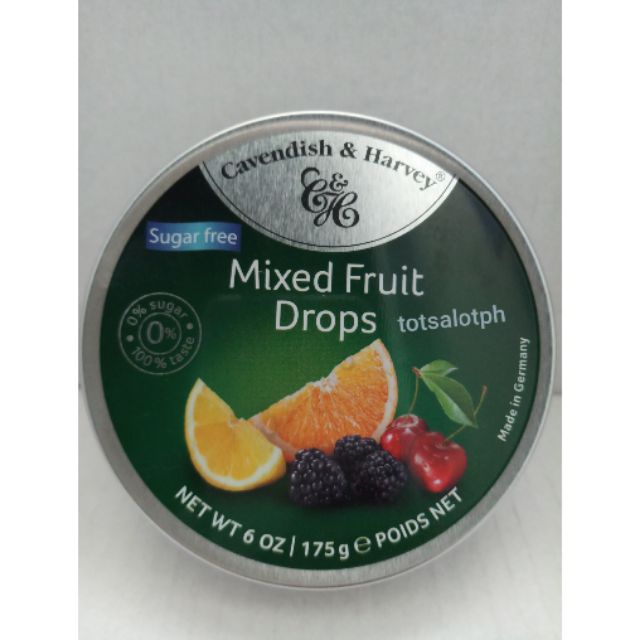 1494 249Ounce Only 5 left in stock - order soon. By Cavendish Harvey. Sugar Free Mixed Fruit Drops in a 175g tin No sugar no guilty pleasure Sealed in a premium silver tin for the highest quality freshness sugar free sweets from Cavendish Harvey made in Germany order now your sweets.