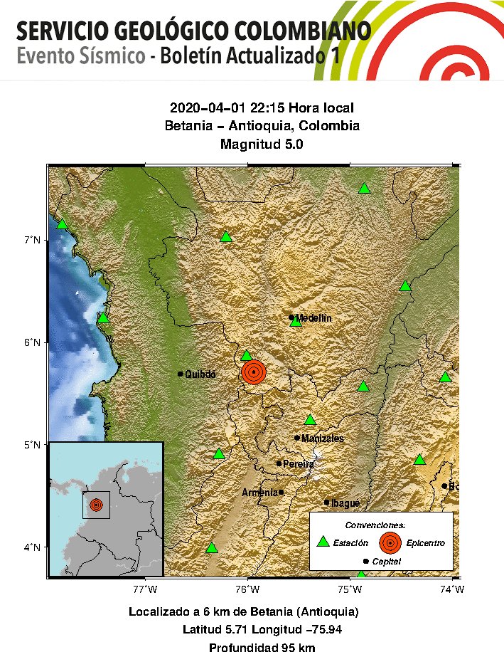 Servicio Geologico On Twitter Sismoscolombiasgc Evento Sismico Boletin Actualizado 1 2020 04 01 22 15 Hora Local Magnitud 5 0 Profundidad 95 Km Betania Antioquia Colombia Noticiaendesarrollo Temblor Sismo Sintio Este Sismo Reportelo